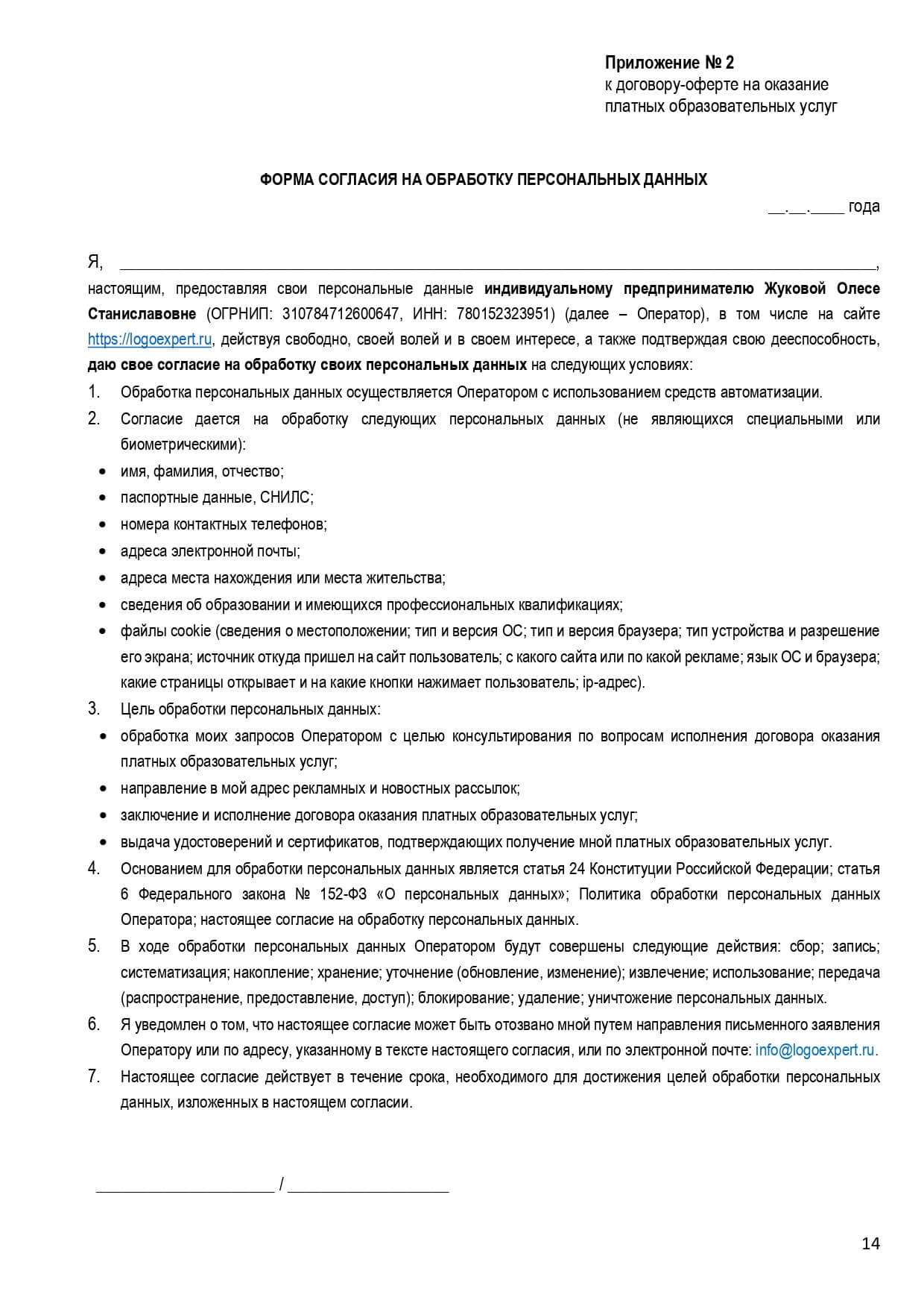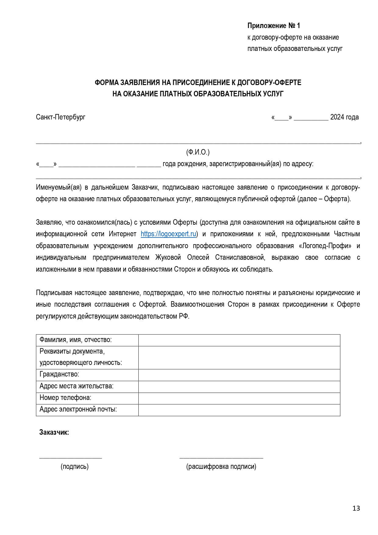 Частное образовательное учреждение дополнительного профессионального образования «Логопед-Профи», осуществляющее образовательную деятельность на основании лицензии серии 78Л02 номер № 653 (рег. № 1723), выданной 16.02.2016 Комитетом по образованию г. Санкт-Петербурга, срок действия лицензии — бессрочно, именуемое в дальнейшем «Образовательная организация», в лице учредителя Жукова Дмитрия Константиновича, действующего на основании Устава, и индивидуальный предприниматель Жукова Олеся Станиславовна, именуемая в дальнейшем «Исполнитель», адресуют настоящий договор-оферту (далее —